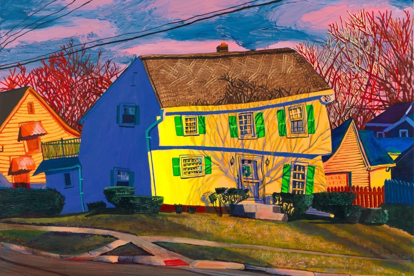 Kunstenaar Gabrielle Garland kwam een aantal jaar geleden al eens eerder aan bod op Mixed Grill. Toen waren we vooral onder de indruk van de manier waarop ze typisch Noord-Amerikaanse huizen weet af te beelden: trippy, vervormd en vervreemdend. Haar recente werk voegt daar nog een aantal zeer interessante lagen aan toe. Bijvoorbeeld de details rondom de huizen, de lange titels die verwijzen naar filmscenes én het gebruik van glitter.
