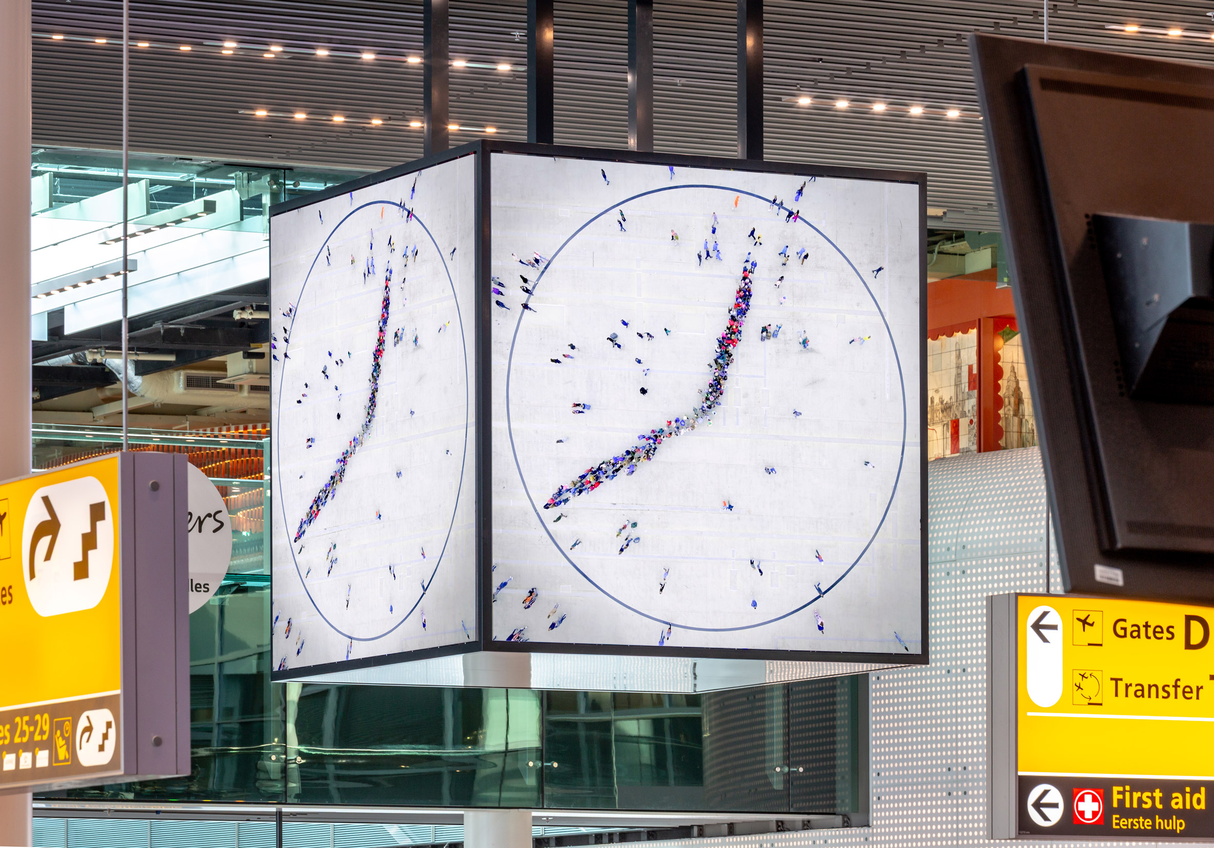 Met deze installatie verlegt Baas de focus van de eenzame kunstenaar naar de kracht van de massa, waarbij de duizenden individuele acties die dagelijks op de luchthaven plaatsvinden worden samengebracht in één rustgevend, ritmisch beeld van de voortschrijdende tijd.
