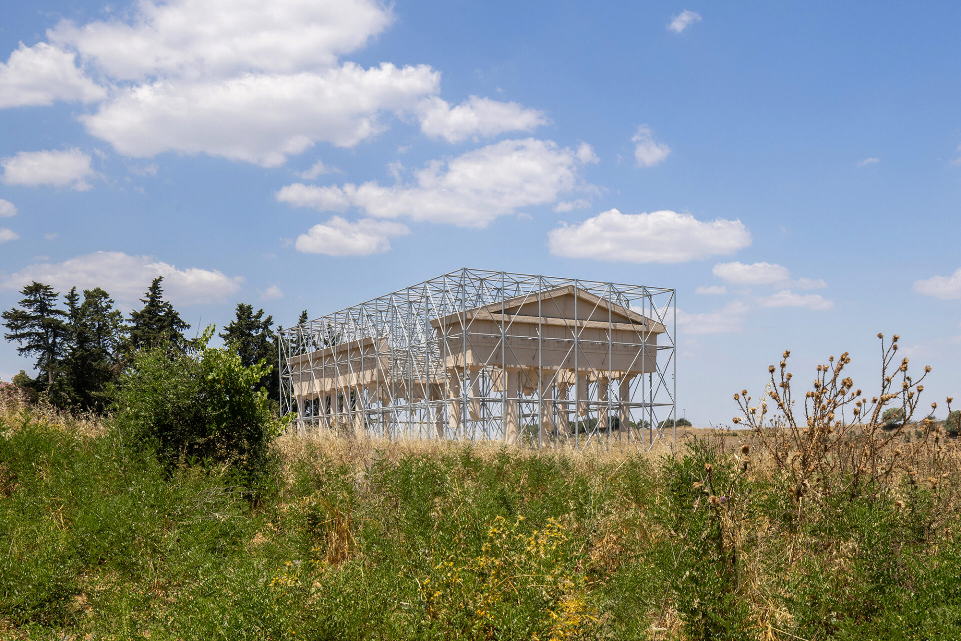 Het werk is 35 meter lang, 17 meter breed en 12 meter hoog en volgt de schaal en geometrie van de oorspronkelijke tempel. Een metalen draagconstructie ondersteunt het zwevende volume. De sculpturale elementen zijn uitgevoerd in kalkmortel, wat een subtiele brug slaat tussen historisch materiaalgebruik en hedendaagse bouwtechnieken.