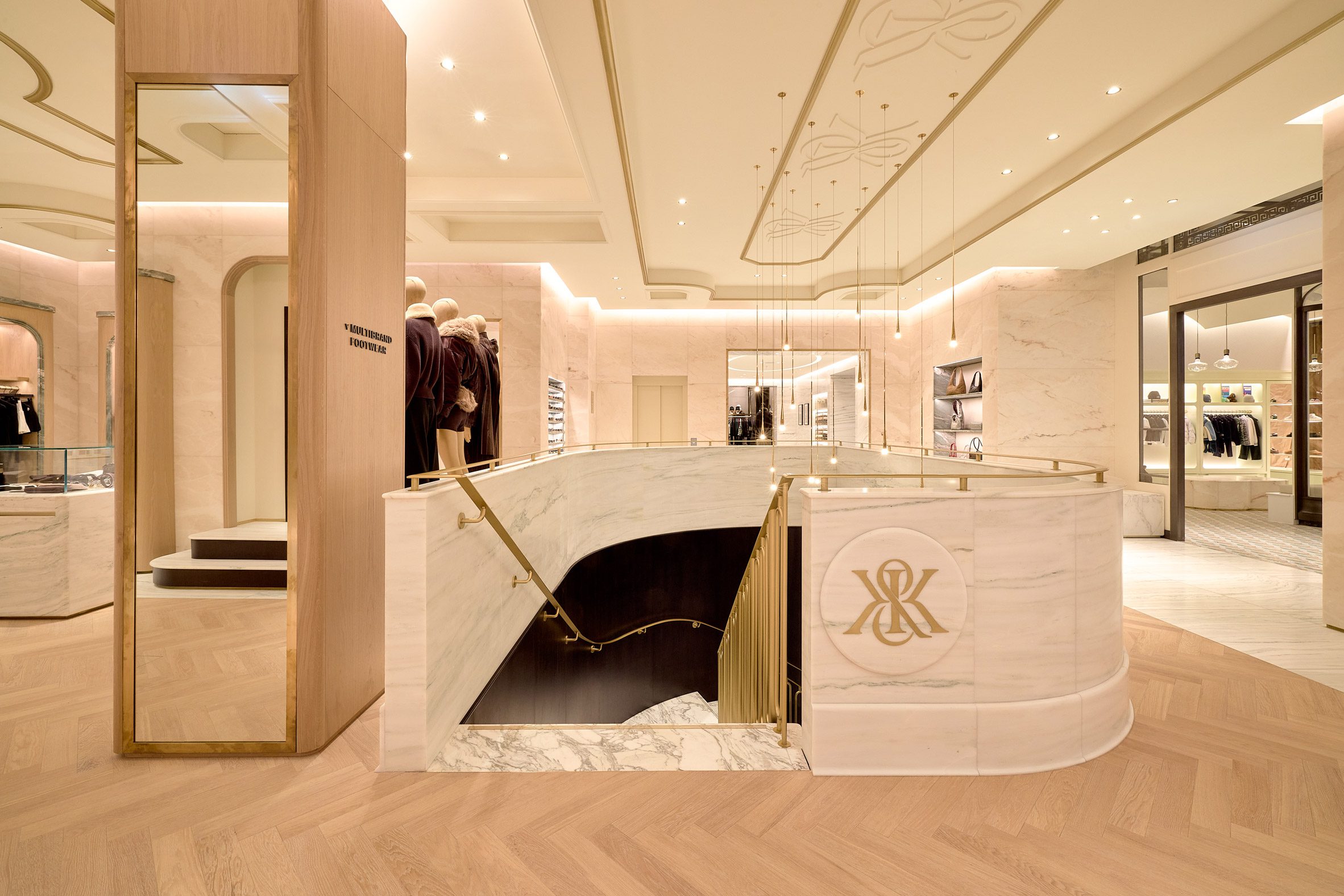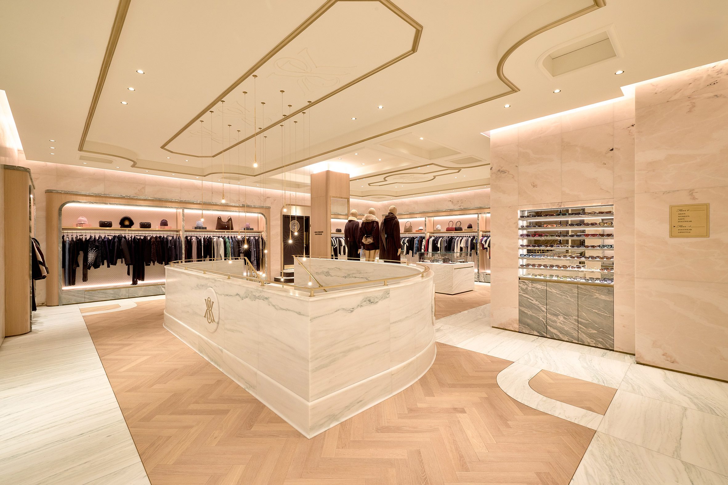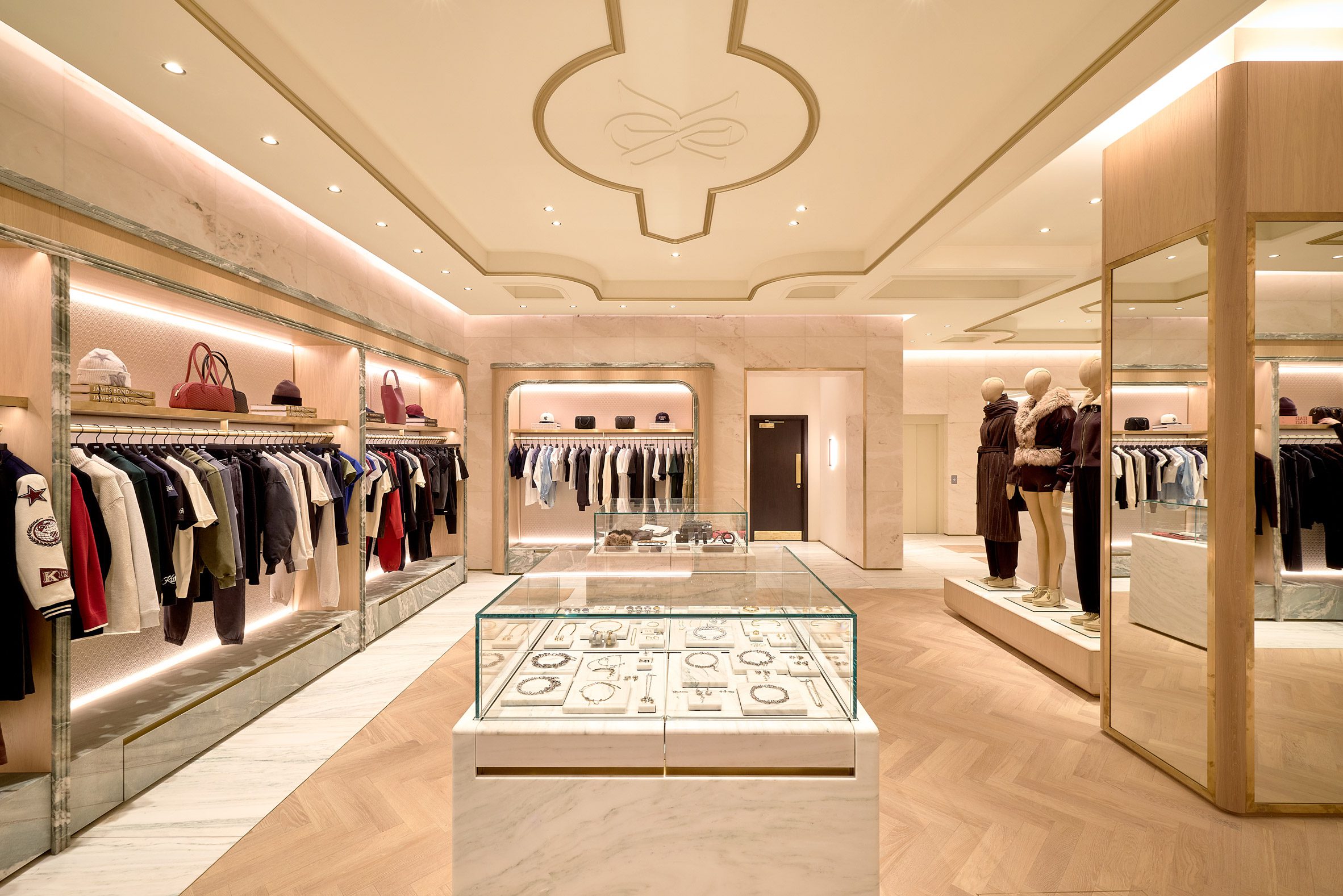 Op de begane grond vind je een duidelijk contrast tussen de dames- en herenafdelingen. De Kith Women-ruimte is licht en luchtig, met een visgraatvloer van eikenhout, wanden bekleed met Estremoz-marmer en accenten van Crystal Tiffany-marmer. Daartegenover staat de ruimte voor seizoencollecties en mannenmode, die juist donker en stemmig is met walnoothouten betimmering en wanden van Belvedere-marmer. “Onze herenafdeling combineert donker en licht met zwart en wit marmer, wat vervolgens overgaat in de damesafdeling – een veel lichtere ruimte,” legt Fieg uit.