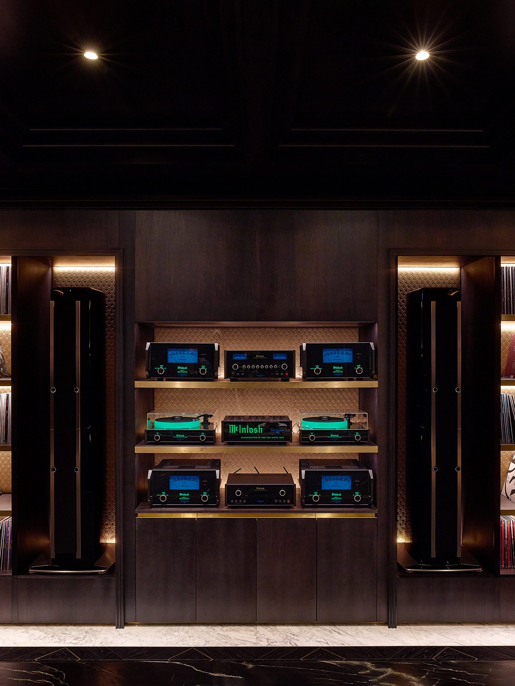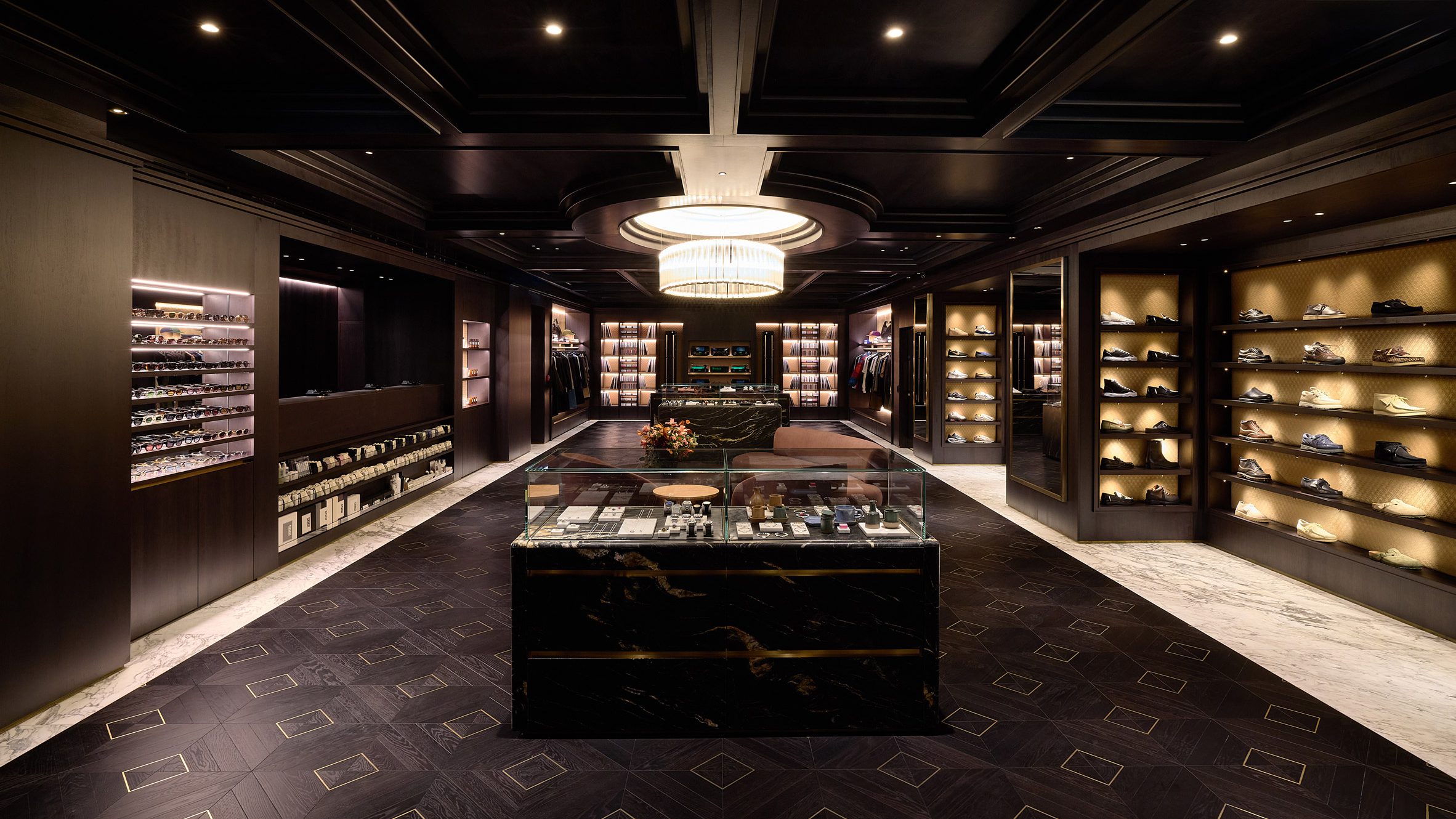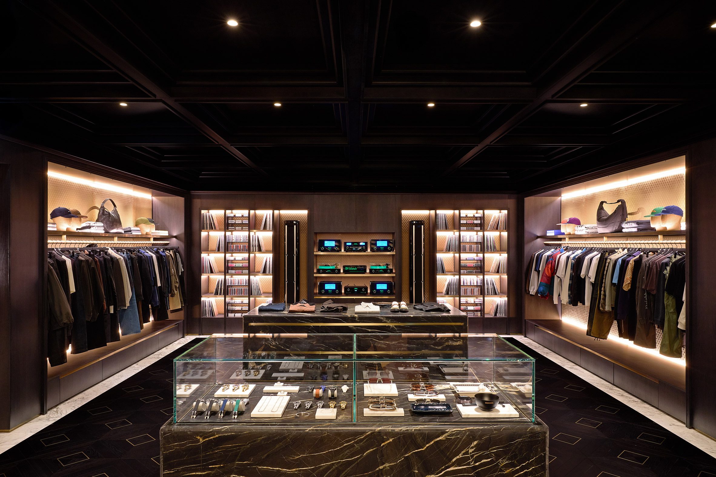 Op de begane grond vind je een duidelijk contrast tussen de dames- en herenafdelingen. De Kith Women-ruimte is licht en luchtig, met een visgraatvloer van eikenhout, wanden bekleed met Estremoz-marmer en accenten van Crystal Tiffany-marmer. Daartegenover staat de ruimte voor seizoencollecties en mannenmode, die juist donker en stemmig is met walnoothouten betimmering en wanden van Belvedere-marmer. “Onze herenafdeling combineert donker en licht met zwart en wit marmer, wat vervolgens overgaat in de damesafdeling – een veel lichtere ruimte,” legt Fieg uit.