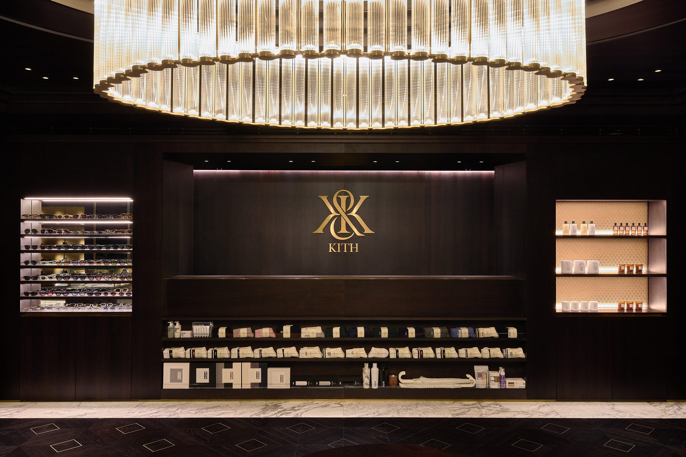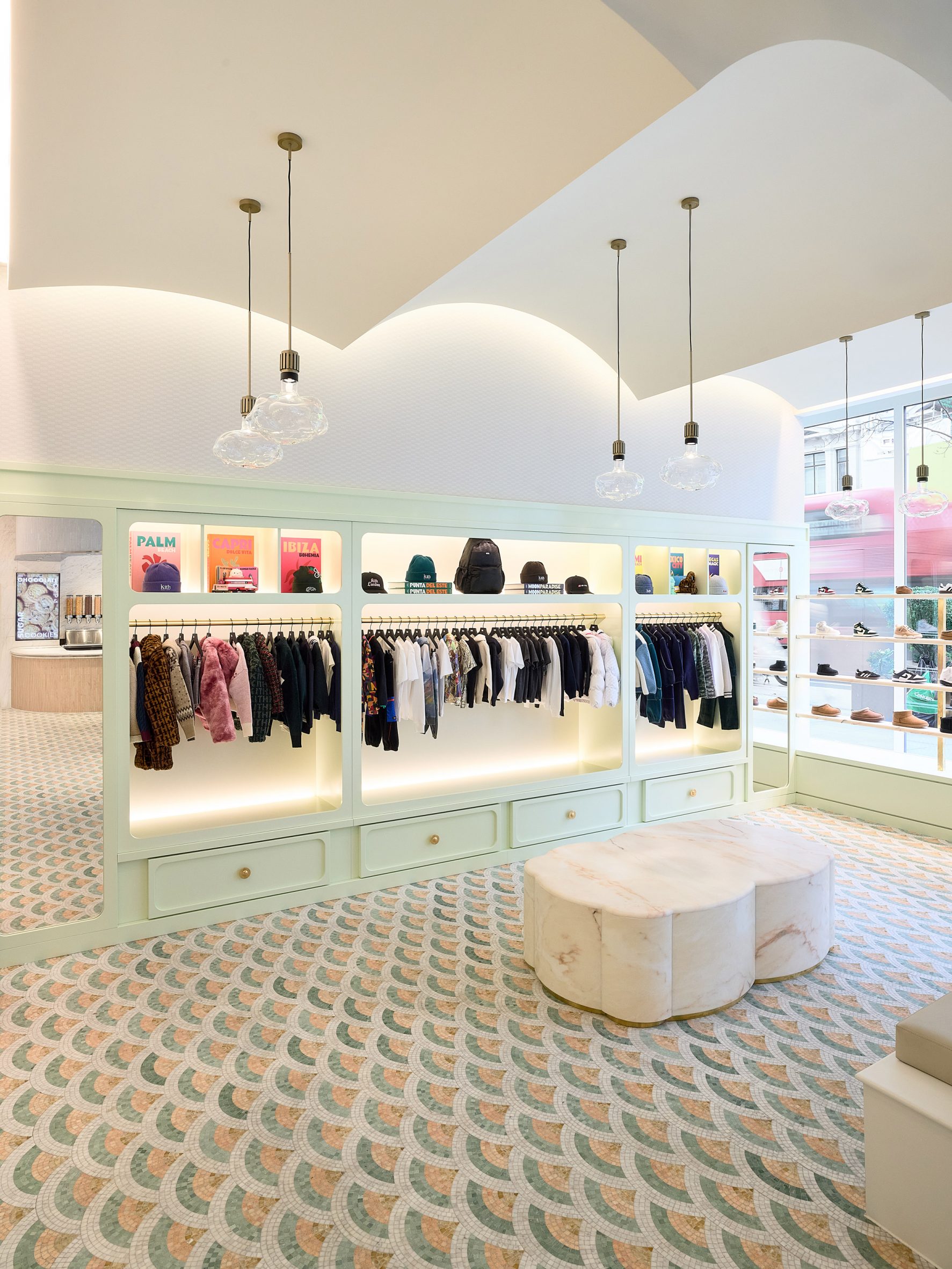 De winkel is opgedeeld in verschillende zones, elk gedefinieerd door een eigen materiaal- en kleurenpalet. De hoofdingang wordt geflankeerd door originele, gebogen glazen ramen die uitkijken op de ruimtes Kith Kids en Kith Treats. Deze worden verbonden door een op maat gemaakt waaiermozaïek. De kinderafdeling is speels maar chique, gecentreerd rondom een zitplaats van Estremoz-marmer en verlicht door dromerige wolkenlampen. Kith Treats, de bekende dessertbar, heeft een zacht pastelpalet en het blad van de bar is vervaardigd uit Volakas-marmer.