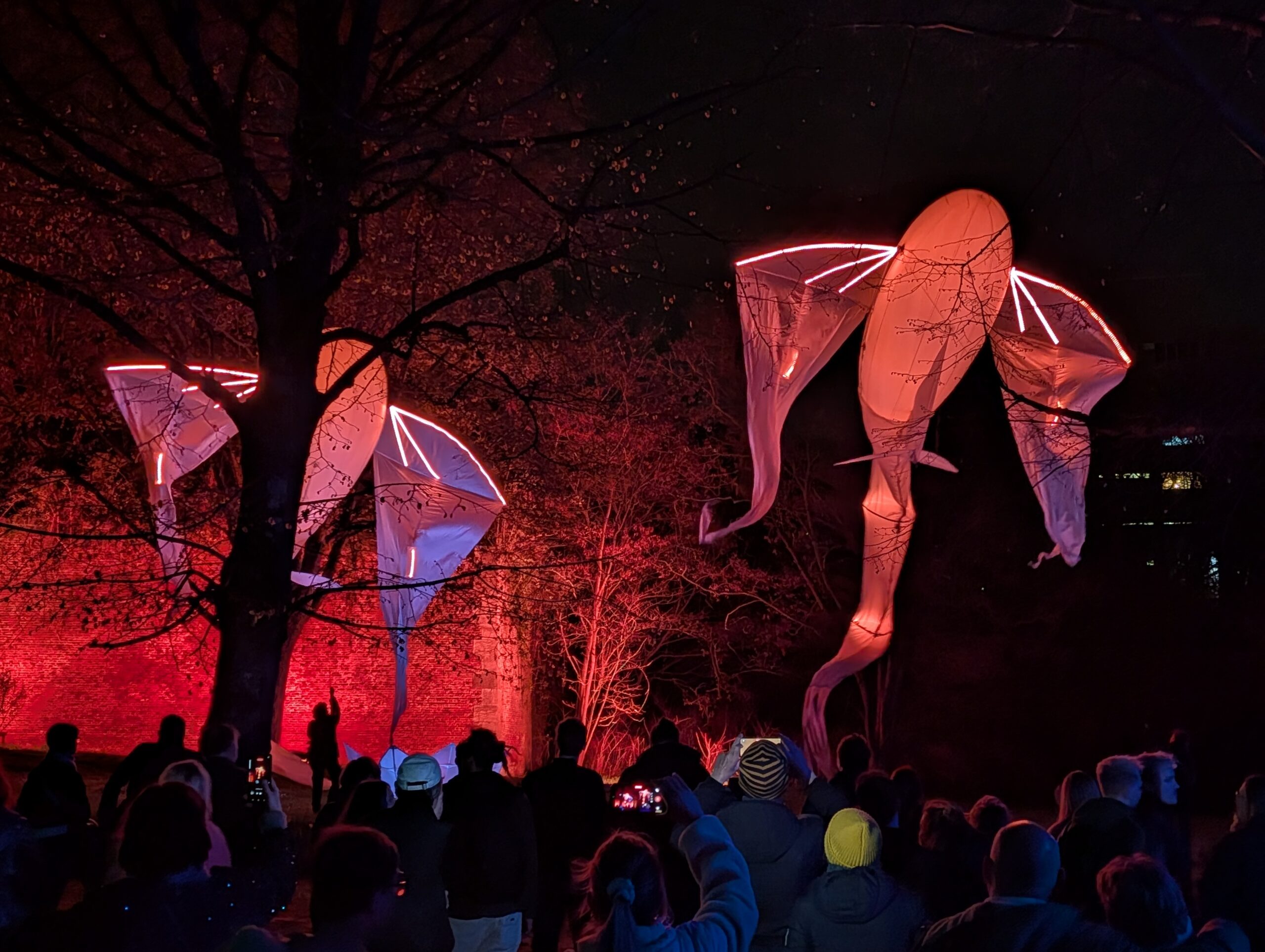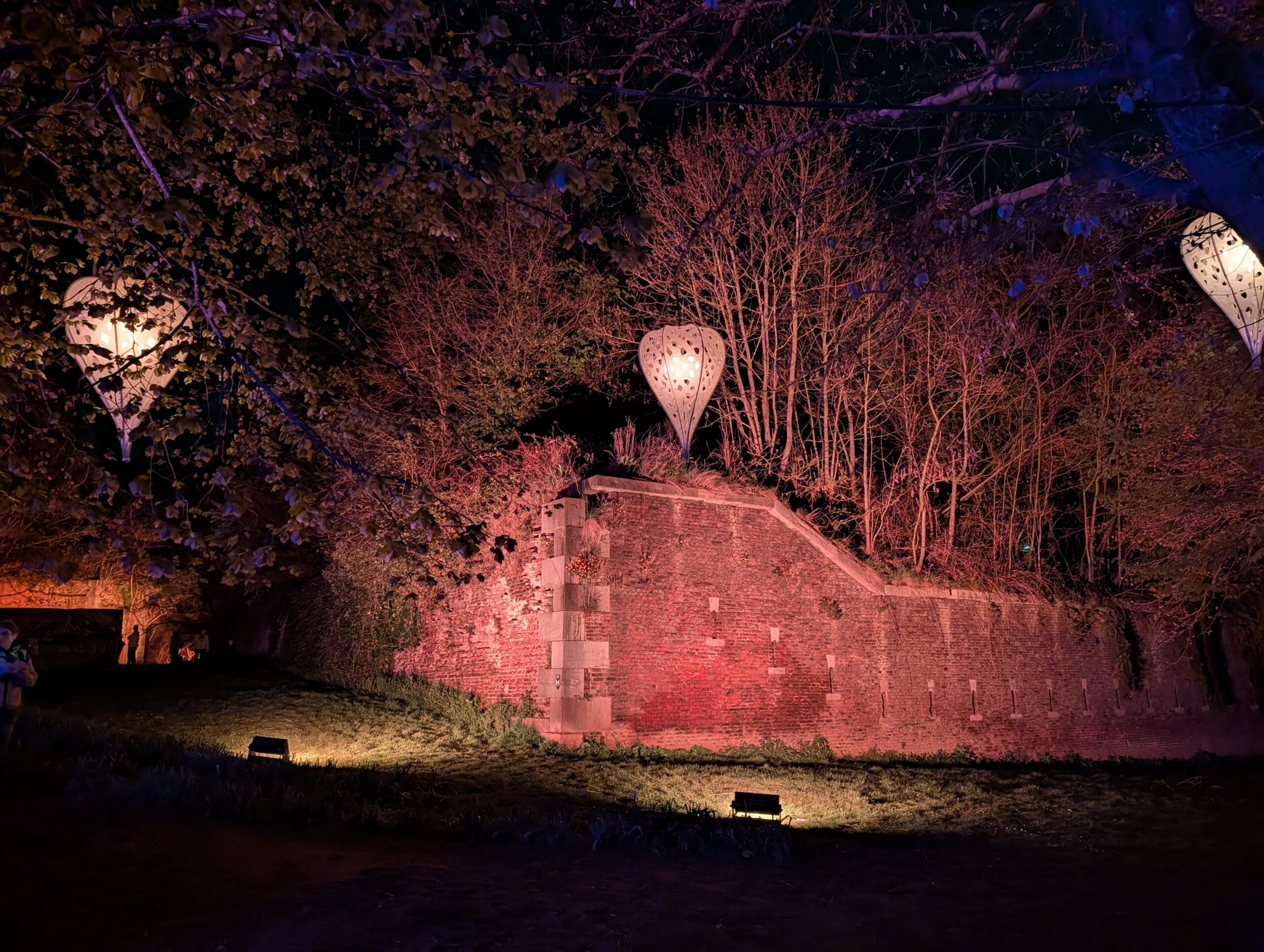 Het uitzicht vanaf de Montagne de Bueren op de stad en de Maas is al indrukwekkend, maar even verderop is een plek waar je nog meer kunt zien. Vanaf het oorlogsmonument Monument au 14ème Régiment de Ligne is het uitzicht weidser. Je ziet de stad, de rivier, het eiland Outremouse en in de verte het prachtige station Luik-Guillemins. Op deze plek, hoog boven de stad, is het niet ver meer naar de muren van de Citadel. In het park dat langs de muren loopt is nog meer lichtkunst te zien: er hangen grote lampions in de bomen die bewegen in de wind en er lijken twee reusachtige fantasiedieren door de lucht te zweven. Dat laatste is een werk van het Franse gezelschap Cie Porté par le Vent dat luistert naar de naam Le Ballet des Luminéoles.