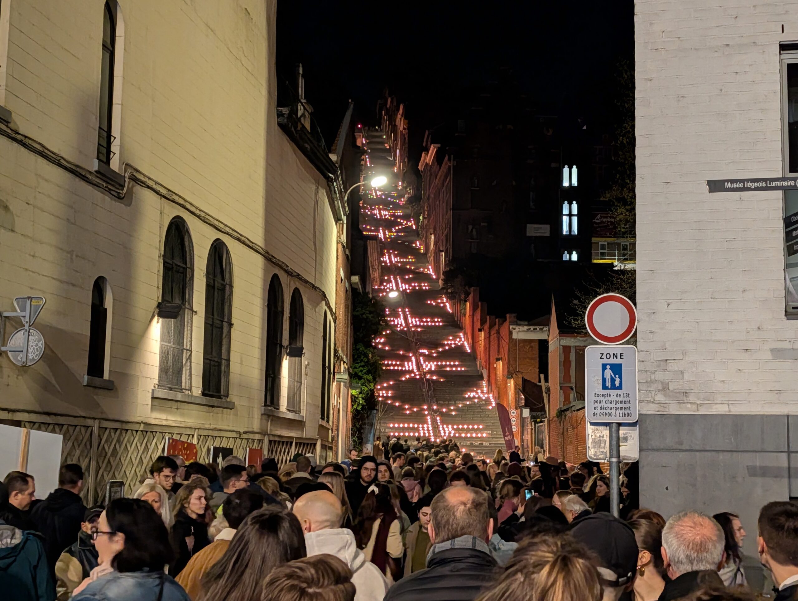 Zoals eerder geschreven kregen we de tip om bij de trappen van Montagne de Bueren aan te sluiten in de rij. Niet alleen om een zo goed mogelijke foto te maken van de verlichte traptreden, maar ook om in kleine groepjes te worden toegelaten tot de route die via de hellingen en oude muren van de citadel zal leiden tot de uitgang aan de Rue Pierreuse. Allereerst lopen we langs de terrassen van Brasserie {C} en de bijbehorende Bar Sauvage, maar al snel lopen we in het halfdonker door smalle steegjes en over steile trappen.