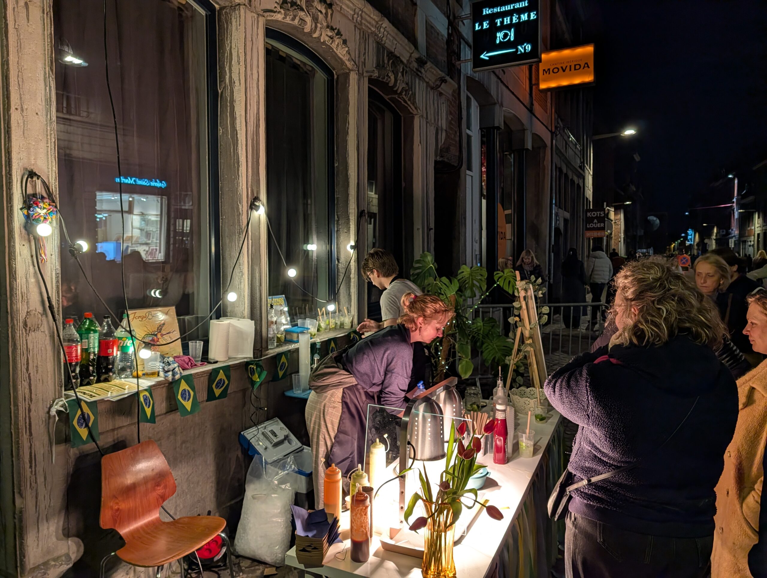 Inmiddels is het echt donker en is het tijd om de route langs de lichtkunst te bewandelen. We komen er al snel achter dat de kunstwerken eigenlijk ondergeschikt zijn aan de algehele sfeer in de stad. Het is vooral gezellig op straat. Overal klinkt muziek, terrassen zijn gevuld en op heel veel plekken is eten en drinken te koop. Een bakker in de Rue de Palais is omgetoverd tot een club waar mensen staan te dansen tussen de ovens.