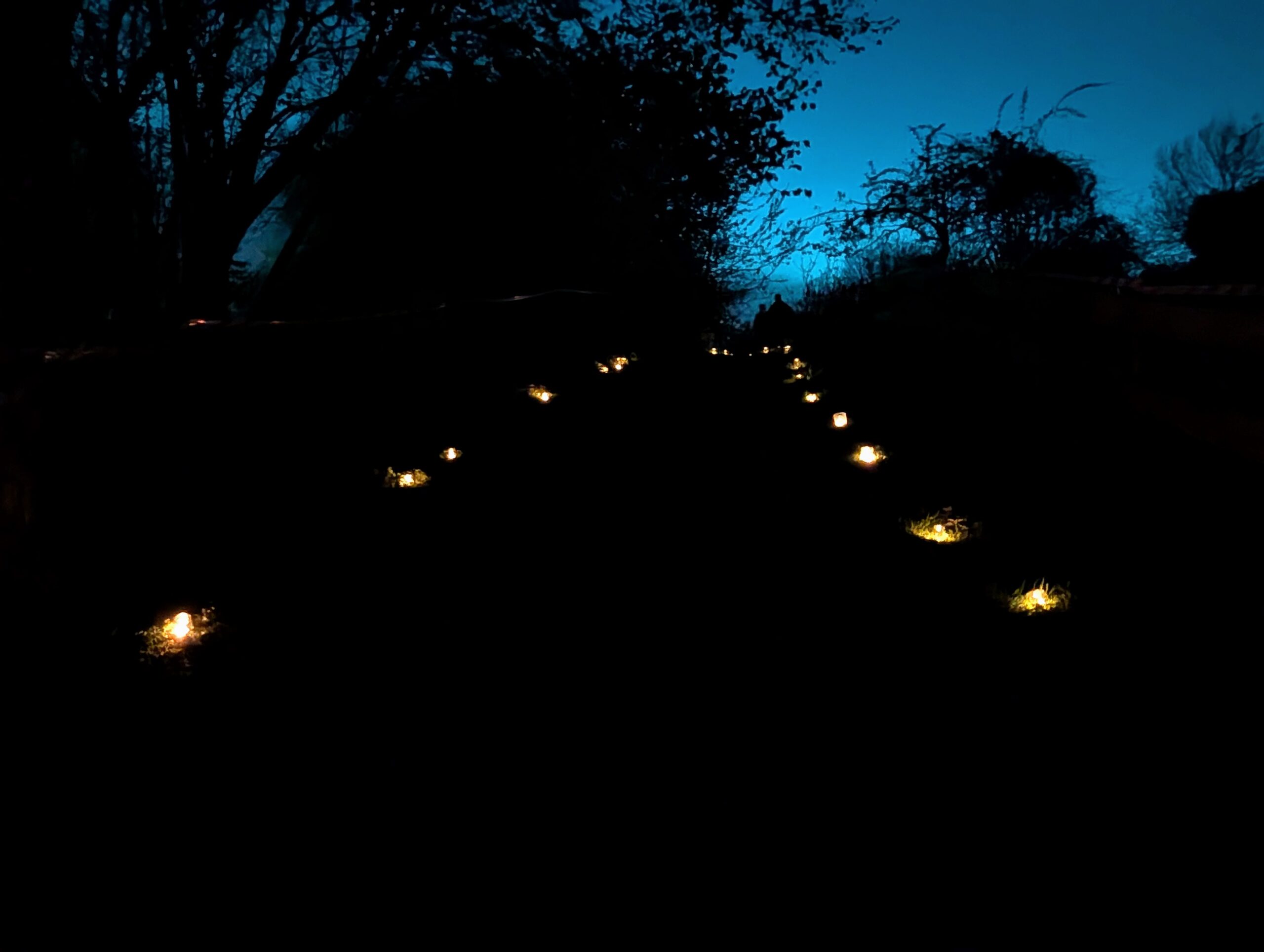 Om daar te komen moeten we de smalle straat Au Pèri in, maar voordat we afslaan lopen we nog een stukje door de flink stijgende Rue Pierreuse om uit te komen bij de Ferme de la Vache. Dit is een boerderij middenin de stad. Op de heuvels rondom de Citadel, wat je zou kunnen beschouwen als het begin van de Ardennen, is veel groen en dus ook ruimte voor agrarische activiteiten. Normaal gesproken werken op deze boerderij mensen met een afstand tot de arbeidsmarkt, nu is de binnenplaats tijdelijk een erg gezellig terras. Door de pikdonkere tuin loopt een route die is verlicht met kaarsen.