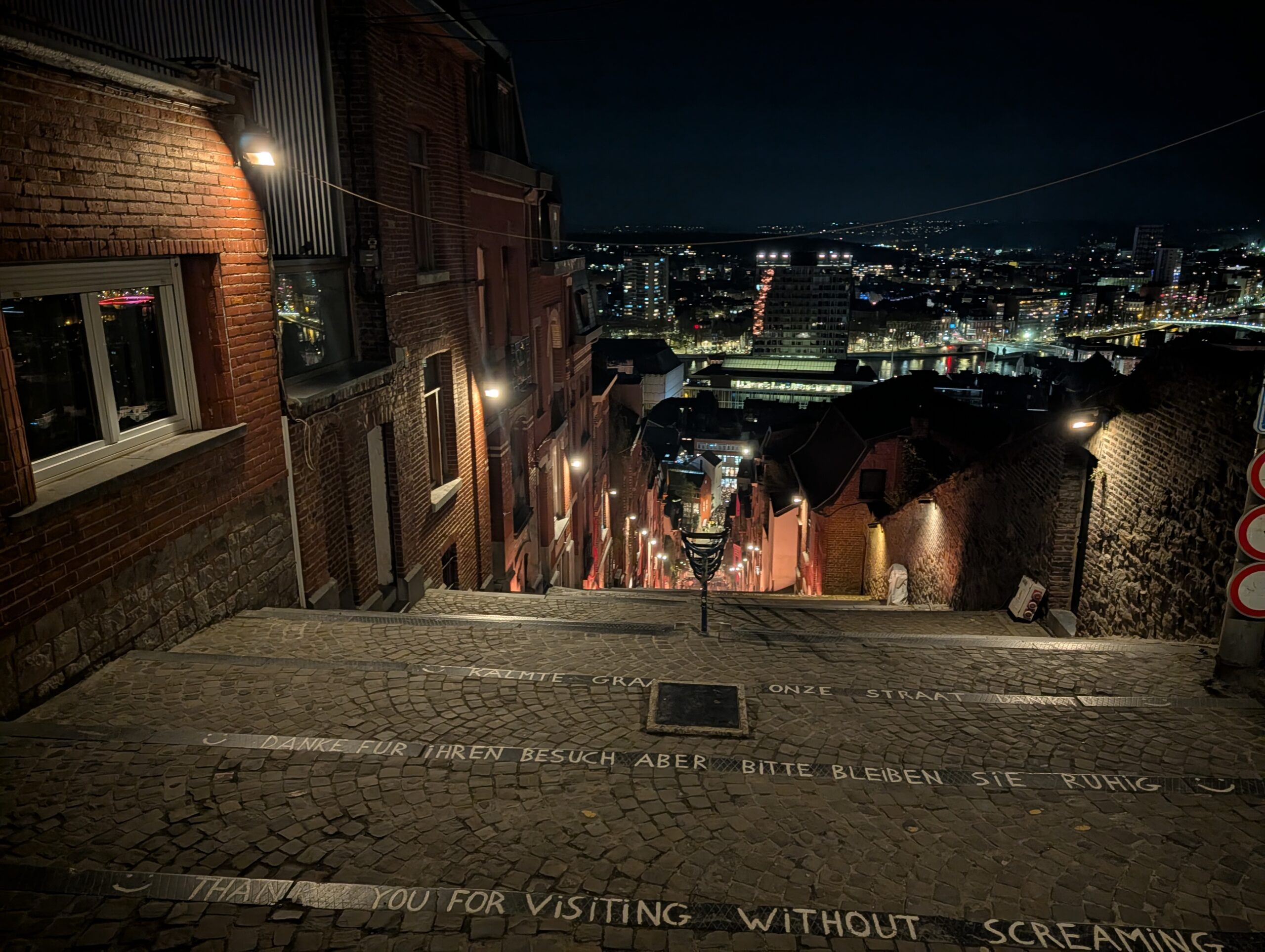 Een festival dat zich in het donker afspeelt, kan natuurlijk pas van start als het donker is. Op de zaterdagavond zou de zon rond kwart over 8 ondergaan, waarna het nog een half uurtje duurt voordat het echt donker is. Een mooie plek om te wachten is Brasserie {C}, een bierbrouwerij met meerdere terrassen en een fijn restaurant. Deze brasserie zit pal naast de iconische Montagne de Bueren en bij de ingang naar smalle steegjes richting de Terrasses des Minimes (daarover later meer).