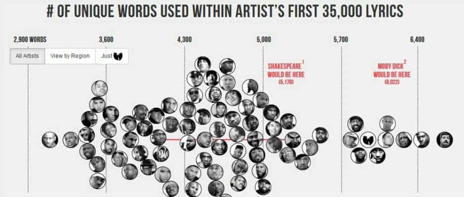 Andere toppers zijn de mannen van de Wu-Tang Clan (zowel gezamenlijk als solo), Kool Keith, CunninLynguists, Canibus en The Roots. Zij scoren allemaal beduidend hoger dan William Shakespeare (de dichter, geen rapper) die op een gemiddelde van 5170 woorden uit komt. Een aantekening daarbij is natuurlijk wel dat de taal in de loop der eeuwen rijker is geworden.