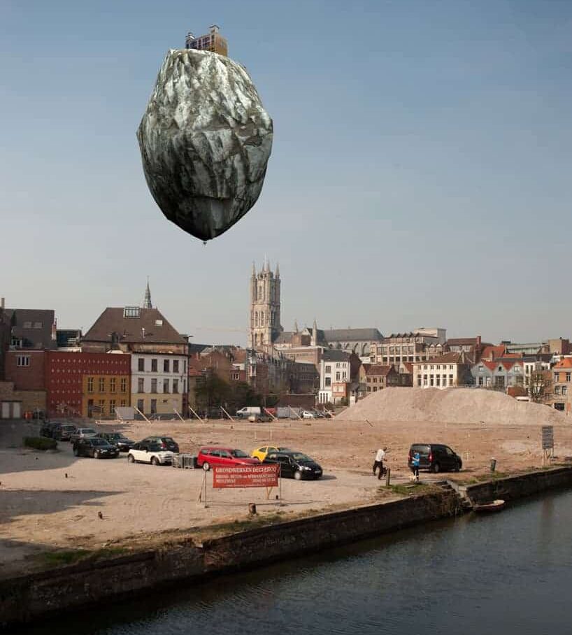 In het luchtruim boven Gent zweeft momenteel een enorm rotsblok. Dit is een werk van de Turks/Koerdische kunstenaar Ahmet Ögüt.